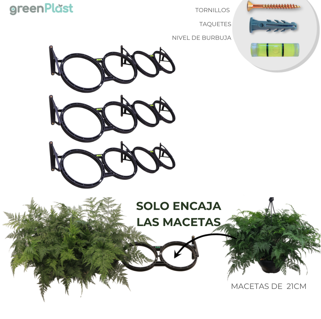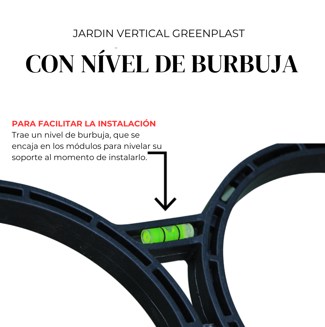 Gracias a su diseño pensado para la eficiencia, la instalación del M² de Jardín Vertical Greenplast es rápida y sencilla. Incorpora un sistema exclusivo de ajuste de inclinación y un nivel de burbuja integrado, lo que garantiza una alineación y nivelación perfectas en todo momento. Además, cada módulo incluye un kit completo de tornillos y taquetes, facilitando aún más el proceso de montaje.