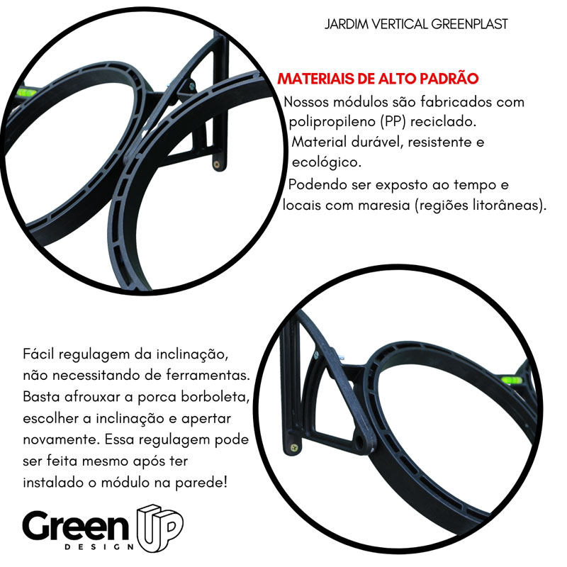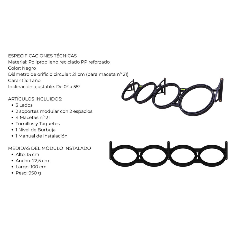 El Módulo Greenplast también se destaca por su versatilidad. Tras la instalación, simplemente coloque las plantas de su preferencia en macetas de 21 cm de diámetro. Esto facilita tanto la selección de plantas como su cultivo, permitiendo un cuidado sencillo y accesible para principiantes y jardineros experimentados.